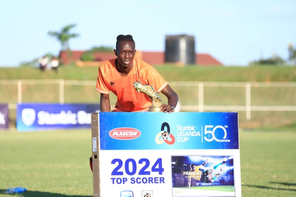 Joseph Dhata receives his Stanbic Uganda Cup 2024 Golden boot after netting six goals.